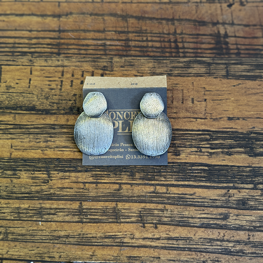 Com textura marcante e acabamento escovado, o Brinco Placa Grafite traz elegância com personalidade. Seu design duplo com movimento transmite força e estilo, enquanto o acabamento fosco e as formas irregulares criam uma estética rústica e atemporal. Ideal para composições modernas, neutras e com presença.